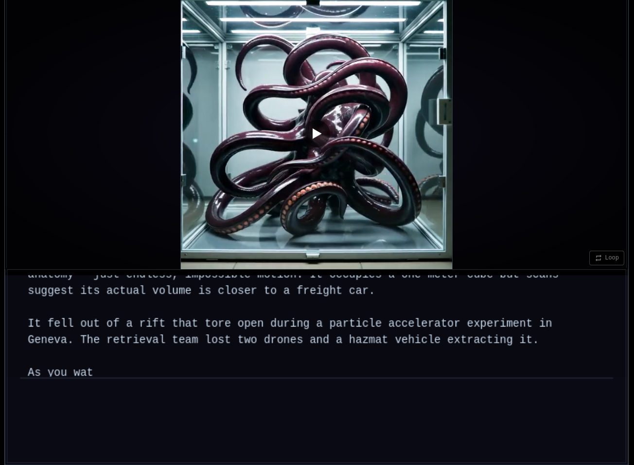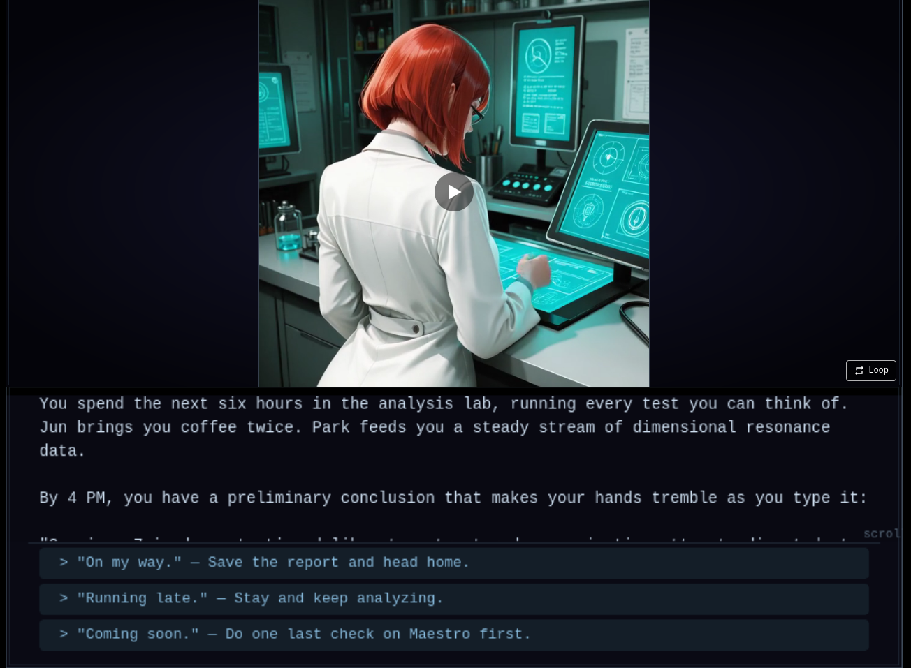You play as Dr. Elena Reeves, a xenobiologist at a desert research facility that studies tentacled creatures pulled through rifts from somewhere else. What begins as an ordinary morning — coffee with her husband, the long drive out to the institute — escalates when one of the specimens starts trying to communicate. Over two days, the branching narrative follows Elena through her work, her marriage, and the creeping realization that something inside the containment wing has noticed her back. The demo ends on a cliffhanger.